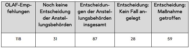 Aufgrund von Empfehlungen des OLAF, justizielle Maßnahmen seitens der mitgliedstaatlichen Behörden betreffend, wurden zwischen 2019 und 2023 37 % aller Fälle zur Anklage gebracht (siehe Tabelle 1). Darüber hinaus wurden zwischen 2016 und 2018 bislang 21 disziplinarische Maßnahmen auf institutioneller Ebene der EU von den jeweiligen Anstellungsbehörden nach dahingehenden 46 Empfehlungen des OLAF getroffen (siehe Tabelle 2).