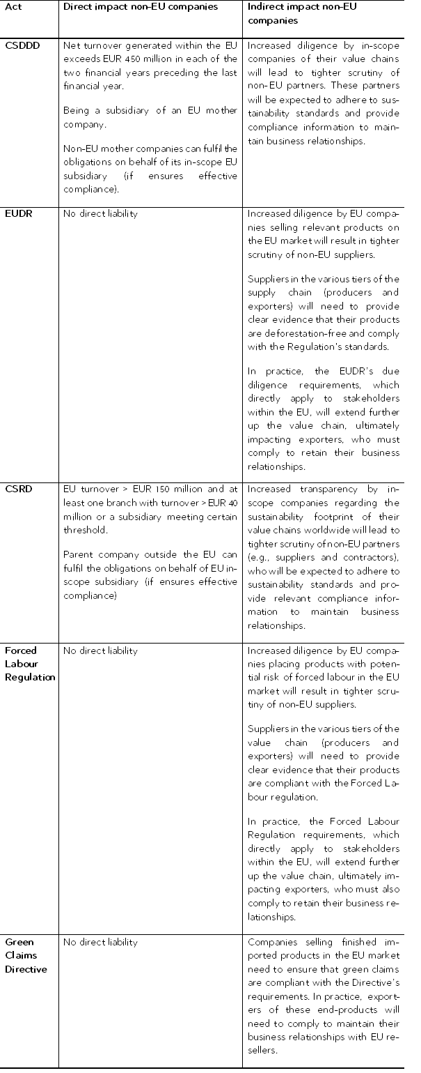 Whether non-EU companies face direct liability or are indirectly impacted, it is clear that the European corporate sustainability framework is intensifying its demands. There is an increasing need for these companies to integrate sustainability agendas into their business strategies and operations, and to be transparent about their efforts. Failure to meet these standards may lead EU buyers and partners to sever commercial relationships with companies that pose a relevant exposure to risk of non-compliance.