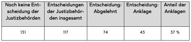 Aufgrund von Empfehlungen des OLAF, justizielle Maßnahmen seitens der mitgliedstaatlichen Behörden betreffend, wurden zwischen 2019 und 2023 37 % aller Fälle zur Anklage gebracht (siehe Tabelle 1). Darüber hinaus wurden zwischen 2016 und 2018 bislang 21 disziplinarische Maßnahmen auf institutioneller Ebene der EU von den jeweiligen Anstellungsbehörden nach dahingehenden 46 Empfehlungen des OLAF getroffen (siehe Tabelle 2).
